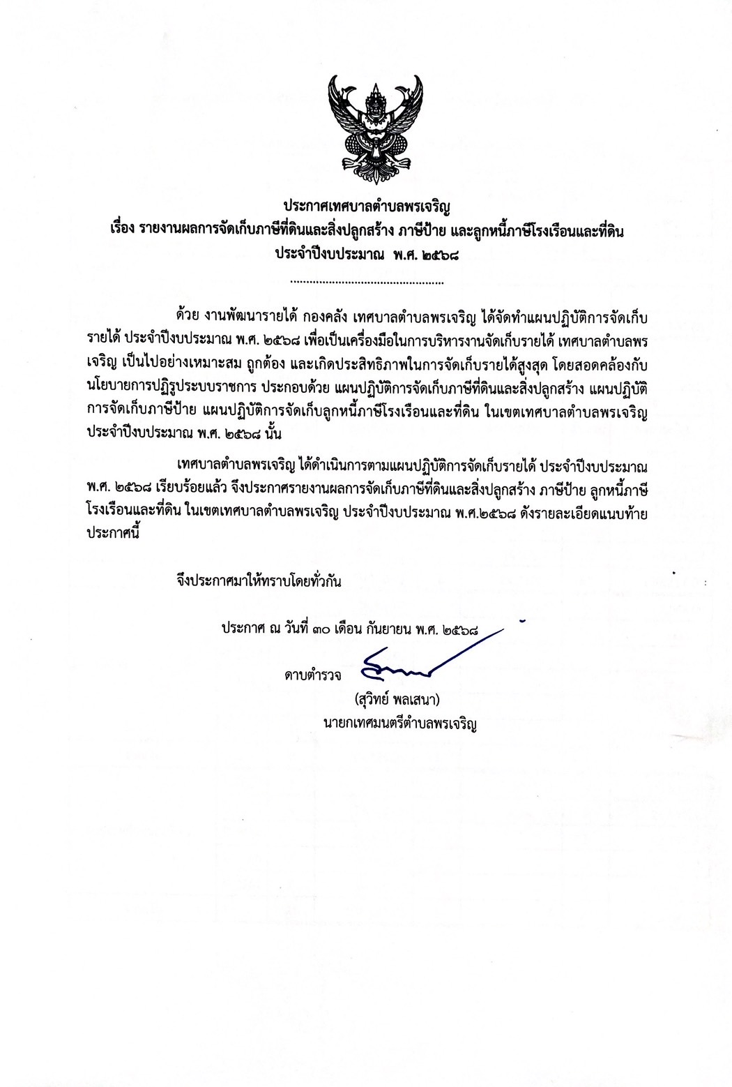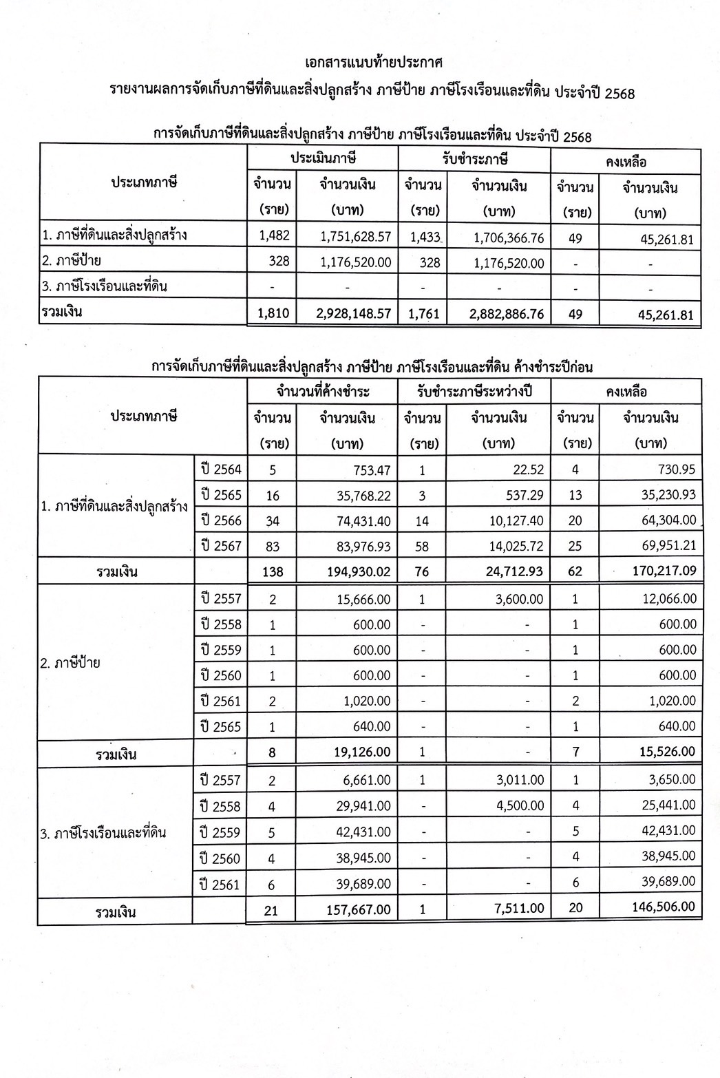 ประกาศรายงานผลการจัดเก็บภาษีที่ดินและสิ่งปลูกสร้าง ภาษีป้าย และลูกหนี้ภาษีโรงเรือนและที่ดิน ประจำปี 2568